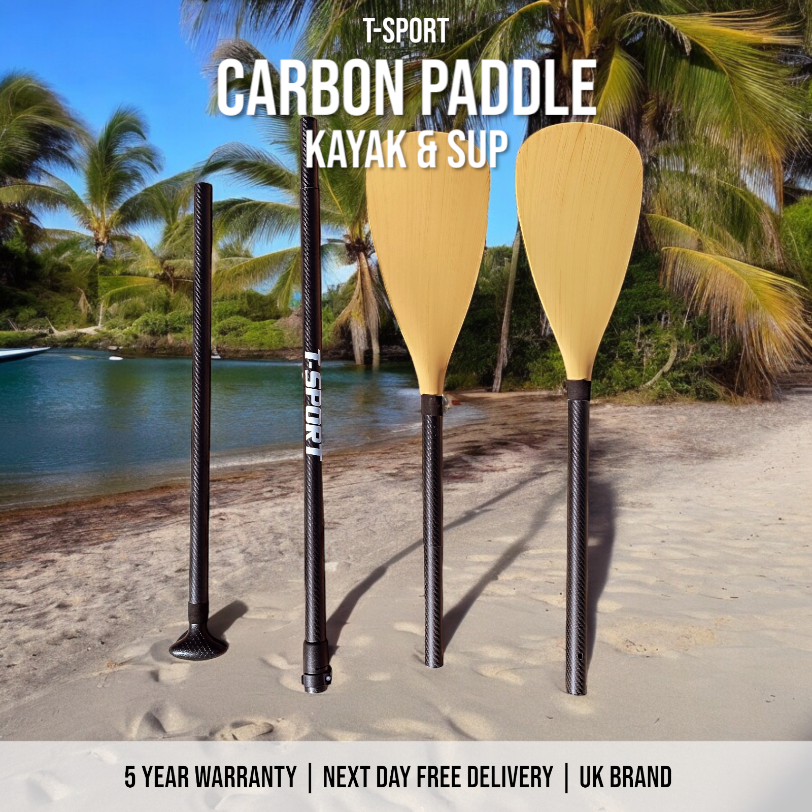 Carbon paddle breaks down into 4 pieces and is full adjustable to suit all sizes just like the aluminium paddle. However, because it is carbon it's incredibly light and only weighs 1170g as a kayak paddle (4 pieces) and only 752g as a paddle board paddle! The carbon paddle has virtually no movement or flex meaning you waste no energy while paddling. If you are looking to dramatically reduce the effort required to paddle for this is the way to do it